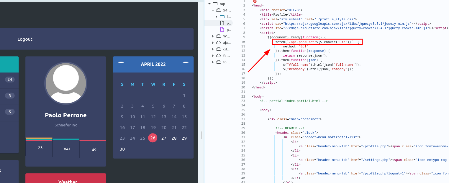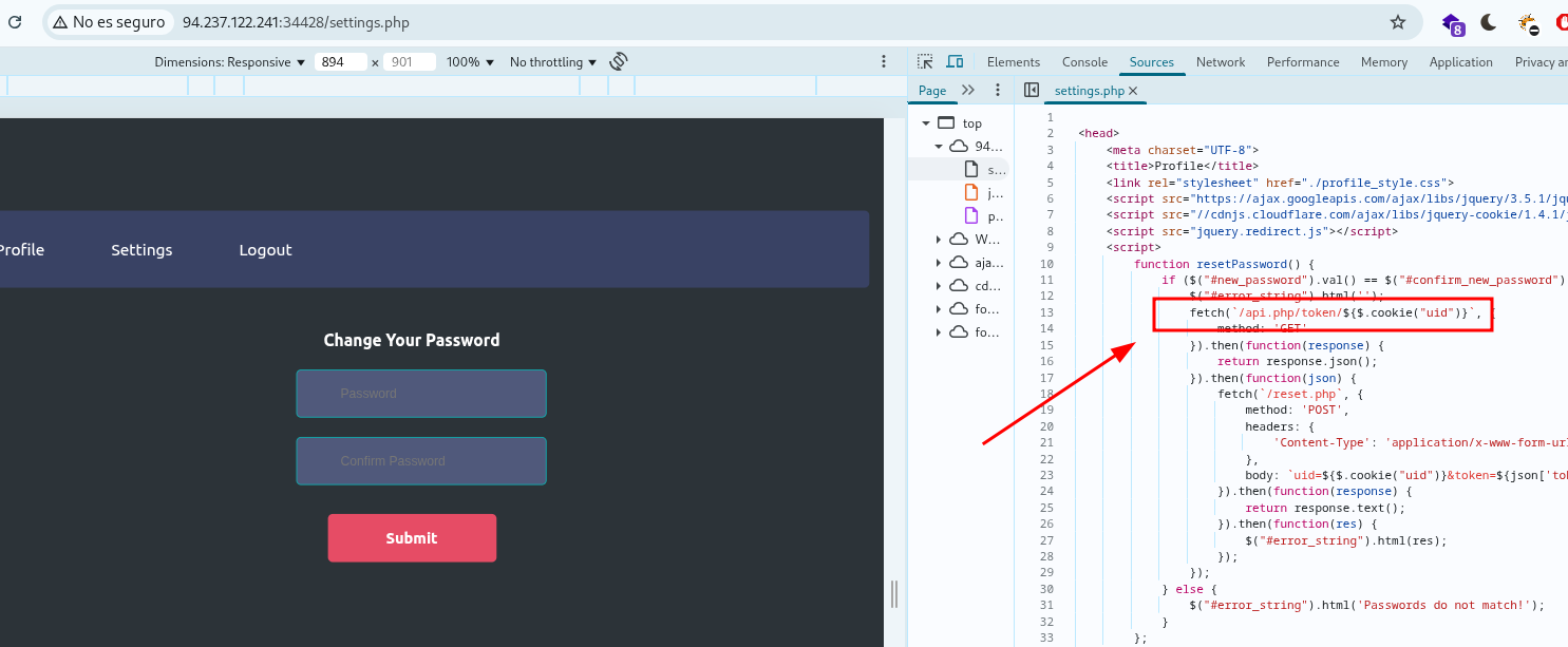 Inspeccionando el código de la página profile.php vemos una función que apunta a una ruta.