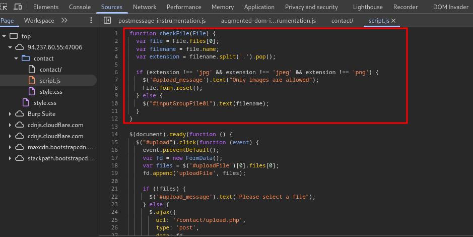 Vemos el campo de subida que debemos testear. Vemos el código donde se está validando la subida del archivo y es bastante similar al que nos hemos encontrado en el modulo.