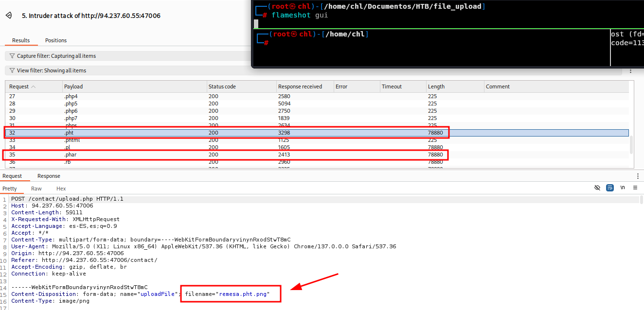 Con Burpsuite fuzzeamos las extensiones para ver si podemos saltar los filtros de la aplicación.