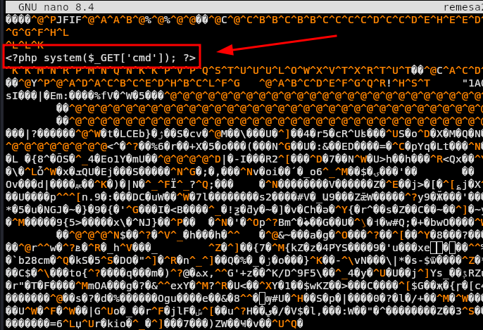 Luego lo que hice fue editar la foto introduciendo el comando de php para obtener una shell cuando consuma la foto. La subí nuevamente.