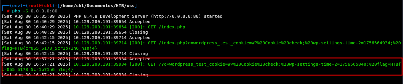 Mientras vemos que cuando hacemos la petición capturamos la cookie de sesión con la flag.